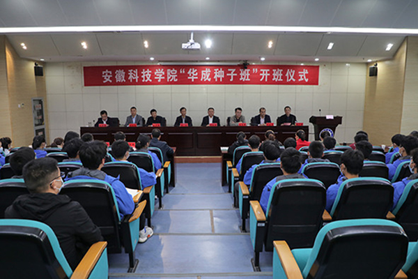 10月19日下午,華成種子班開班儀式在安徽科技學院鳳陽校區(qū)新圖書館會議中心一樓報告廳隆重舉行。公司董事長劉良柏,總經(jīng)理王平信等參加儀式,安徽科技學院黨委副書記、院長李震應邀出席并發(fā)表講話。校教務處處長、創(chuàng)新創(chuàng)業(yè)學